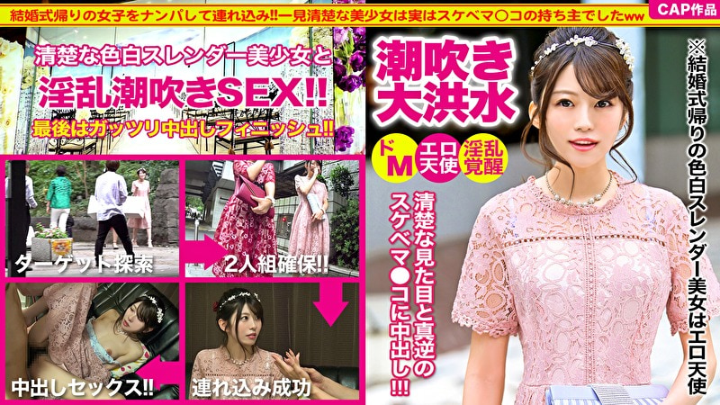 都内にある高級結婚式場近くで、結婚式帰りの幸せ気分の女子をナンパ!綺麗なドレスを着た美女2人組に声をかけ「ドレスのモデルになってほしい」と依頼するも先輩らしき方に断られてしまいますが、なんとかお願いしOKいただきスタジオへお誘い成功☆2人は同じベビー用品の会社で働いているそうで、控えめな性格の色白美人のみくるちゃんは21歳で後輩とのこと。透明感があって純粋そうで最高の可愛いコちゃんですね!先輩から撮影するのでみくるちゃんは別部屋に移動し、恋愛トークなどで距離を縮めながら、押しに弱そうなので流れでイチャついてっちゃいますwwキスして体を弄れば照れながらも応じてくれ、次第に足を開き卑猥な行為に没頭していきます。手マンでは噴水のように潮を吹き、電マではシャワーのようにお漏らしを撒き散らし、清楚ななりしてスケベまこの持ち主でしたwwおっぱいも意外に大きく、薄いピンクのカワイイ乳首で完璧ボディです!ちぽを口いっぱいに頬張り、涎を垂らしながら頭を上下に激しく振り、顔に似合わない激しめのフェラチオも堪りません・・・。細い体にちぽをブチ込みガンガン打ち付ければ、泣くように喘いで絶頂。大量お漏らしをしながらもピストンは止まず、ぐったりしてしまったところへ中出しフィニッシュ!呆然としてましたが気持ち良かったので満足そうです♪ / 結婚式帰り女子をナンパして中出しセックスww色白スレンダーで可愛い後輩ちゃんはエロ天使だった・・・!!淫乱覚醒して潮吹きお漏らしで床はびしょびしょ!